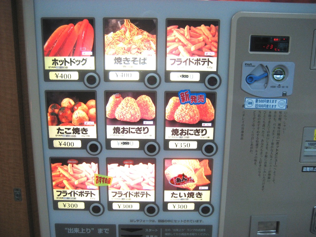 Japan is the land of the vending machine. One of my hobbies is to take photos of all of the different types while I travel around Japan. You will notice them everywhere and there are many different offerings. Most people would be familiar with the standard cold drinks but here, there is also hot drinks in cans and bottles available from, in many cases, the same machine. Just remember when buying a can of coffee that the red sticker is for warm and the blue is cold. You’re on your own whether it comes with sugar or milk. I like to just call it a lucky dip. After a few attempts you will find the one you like the most. Beer vends are common and you may even see one that sells large bottles of whisky, gin and red wine. I have seen them selling vegetables, apples, eggs, fishing tackle and live bait, hot chips and fried food, cup noodles, cans of oden, onsen water, ice cream, pyjamas, medicines, sex toys, fresh flowers, live gold fish and the list goes on. The best coffee is from the machine that has the video footage of the drink being made in the machine and plays a catchy tune. Most machines will take 1000 yen notes Another odd thing is that they can be located in the most bizarre spots. You will see them on a quiet roadside, down laneways that look forever deserted and even on the top of some of the ski resorts. Please take a photo and send it on to me if you see any strange one’s on your travels.